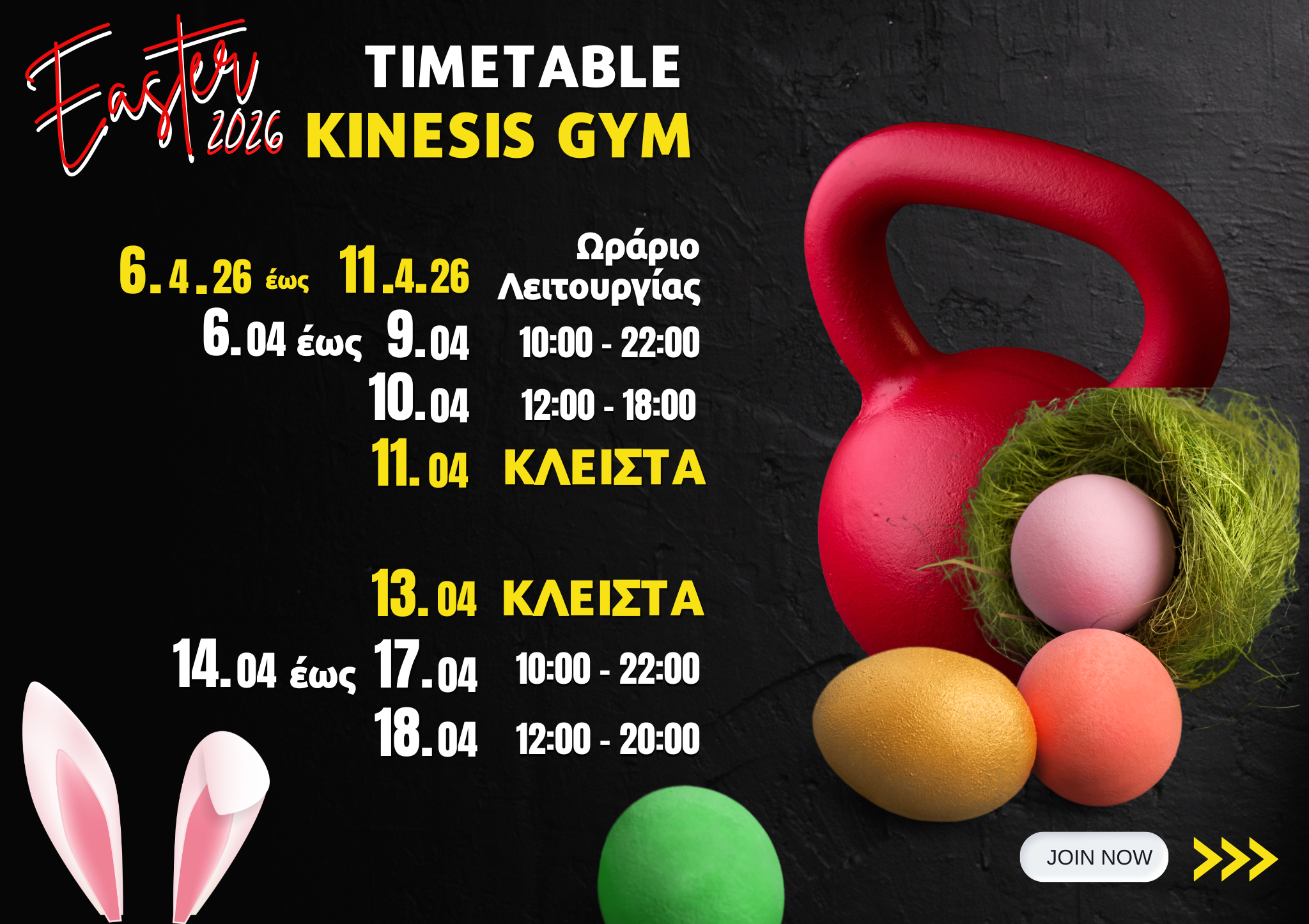 Το Kinesis Gym σας ενημερώνει για το ωράριο λειτουργίας και το πρόγραμμα ομαδικών προπονήσεων κατά τη διάρκεια της Μεγάλης Εβδομάδας και της εβδομάδας μετά το Πάσχα. Σας περιμένουμε να συνεχίσουμε δυναμικά τις προπονήσεις, ακόμη και μέσα στις γιορτές!